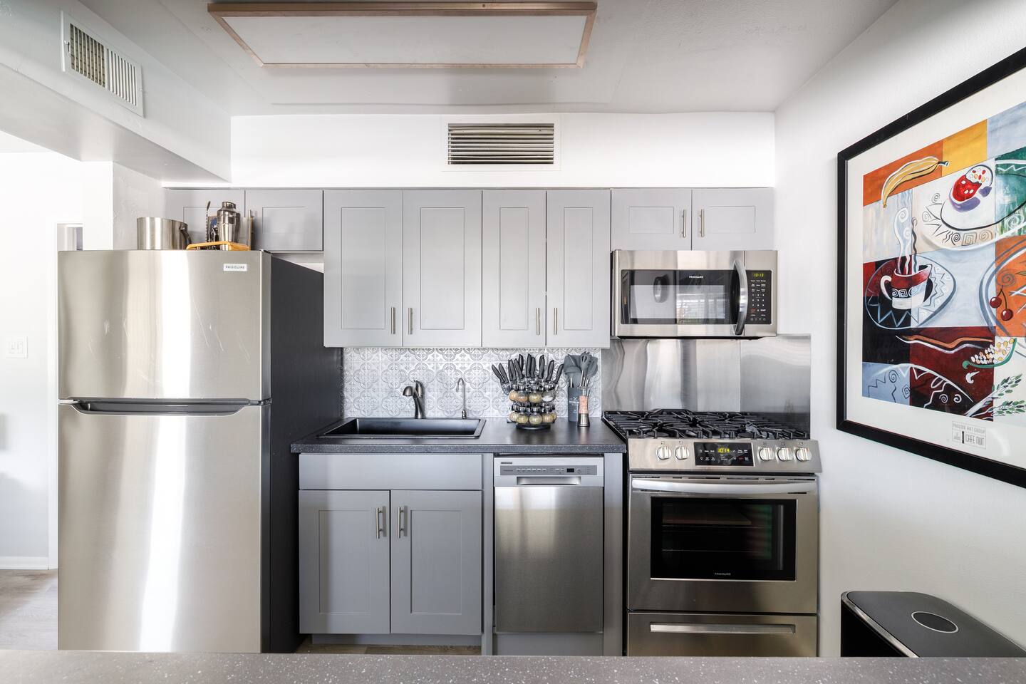 This stylish 1BR condo is updated with all the modern conveniences that you would need and desire! There is a cozy feel and comfort throughout this space. Nestled in a mid-century modern community in the heart of Old Town Scottsdale, the unit is just walking distance to all local area restaurants, bars, shops, and the Entertainment District
