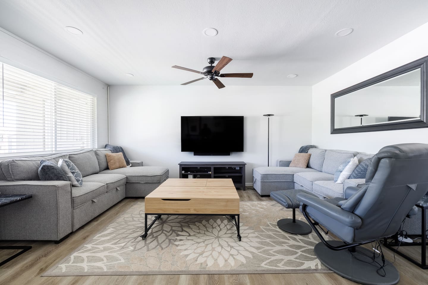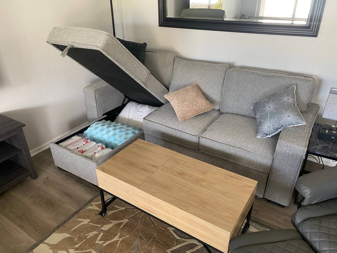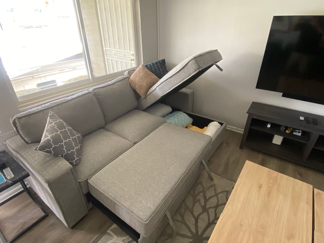 The living room has 2 comfy sofa couches that can convert to full-sized beds with available storage, bedding, and a Zinus 1.5 inch foam cover. There are 2 coffee tables that are on rollers with storage and can be adjusted for working and varied height use. There is also a massage chair with an ottoman for lounging. There is a 65-inch Samsung Smart TV with light strips and HueLiv accent smart lighting. The bedroom has an adjustable Tempurpedic zero-gravity frame with massage features and night-light with a super comfortable Casper mattress on top. The bedroom also has a 43 inch Samsung Smart TV. The kitchen is updated with Stainless Steel appliances including gas burners and a stove. The dining area has comfortable chairs and a comfortable lounge bench that can be used for multi-use seating. The unit has been redone with dimmable lighting throughout. There is Gigablast Cox wifi for all your working, gaming, and internet needs. There is a large stacked washer-dryer in the walk-in closet. There are smart accent table lamps with additional power outlets and USB-A ports in the living room and bedroom areas. *Important: Though our smart TVs have streaming apps installed (Netflix, Disney+, Amazon Prime), guests would need to log in with their own credentials. Please remember to logout of the apps at checkout. IMPORTANT NOTICE: The community operates on a central chiller/cooling system with individual air handlers in each unit. Depending on the season, units will have either AC or heat, but not both simultaneously. The building management determines when to switch between heating and cooling. Starting 2/22/2025, the building management has switched the settings from heat to cool mode. This is until further notice. Registration #: 2024214