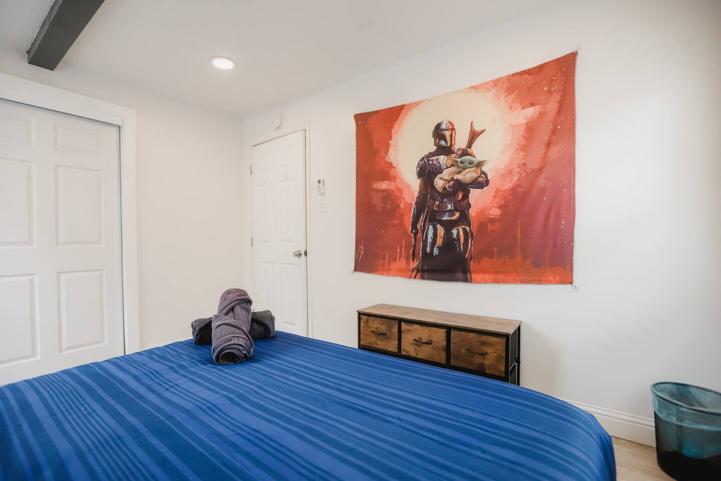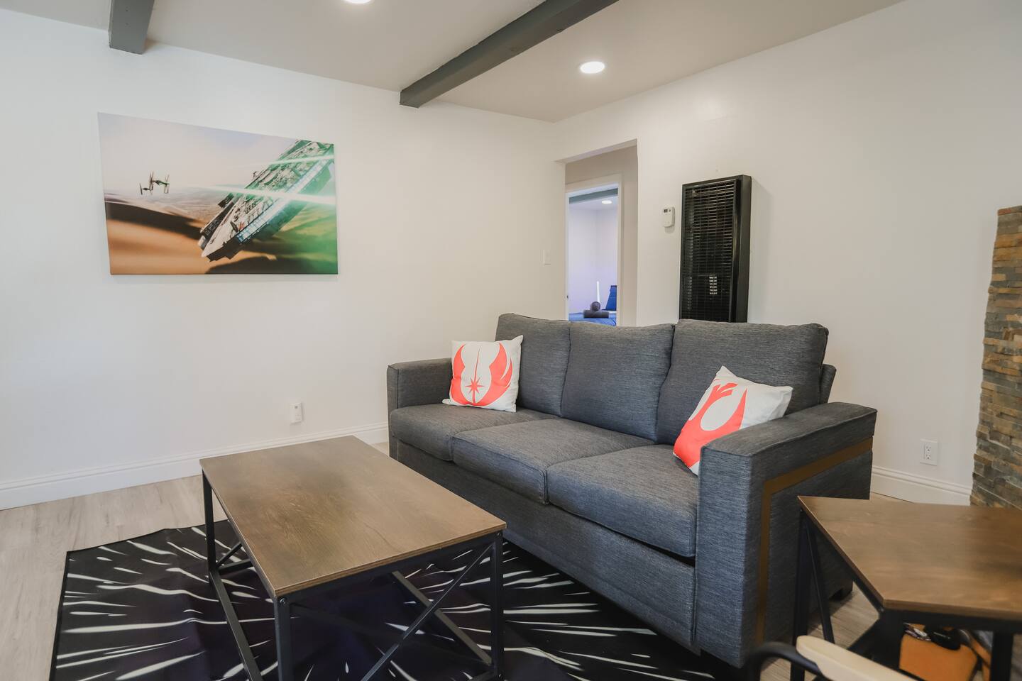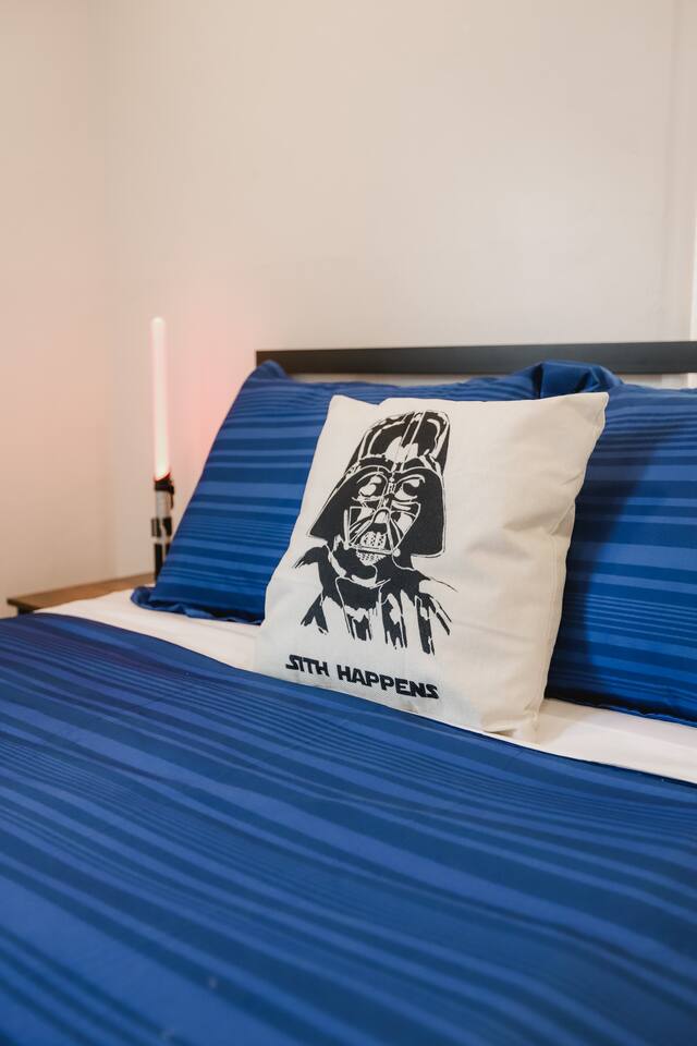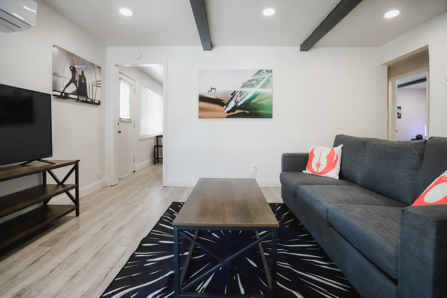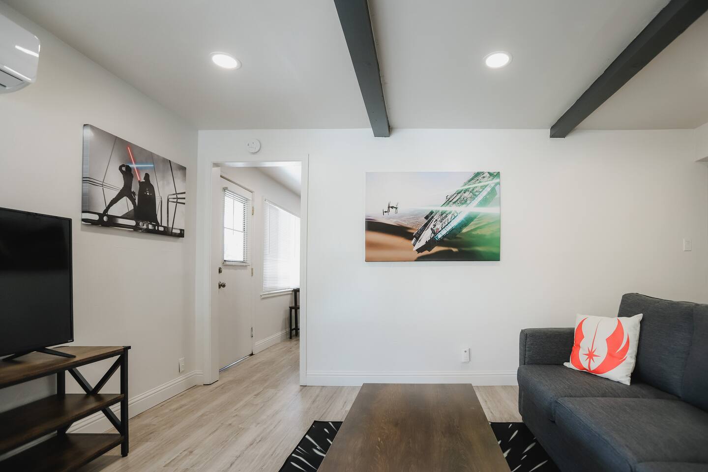 Our modern, updated space has all the comforts of home while you are away. This 2x1 is decked out with Starwars - themed decor throughout... May the force be with you! *Important: Though our smart TVs have streaming apps installed (Netflix, Disney+, Amazon Prime), guests would need to log in with their own credentials. Please remember to logout of the apps at checkout. Book with us and get: - Professionally cleaned home - Virtual Concierge 24/7